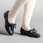 These slip-on shoes are accurate for c. 1790 - 1820. They feature an all leather upper with bound edges and a grosgrain ribbon tie on the vamp. The lining and soling are both leather, with the edges of the sole and stacked leather heel blacked. These beautiful shoes have a rounded toe and can be worn with daywear for women, perfect for Jane Austen, Napoleonic Era, War of 1812, and other Regency events.