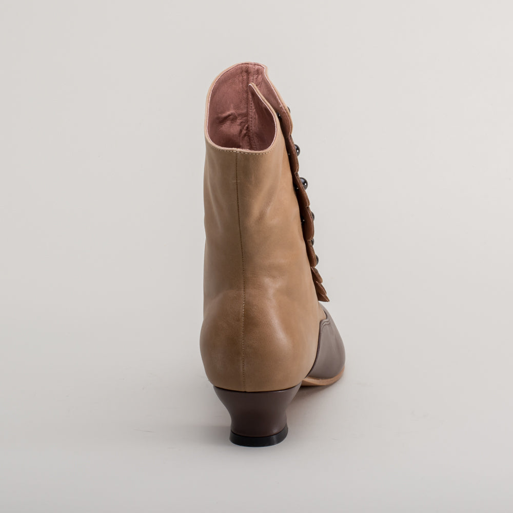 These mid-Victorian and Bustle Era boots have square toes, a short heel molded from an original, and an attractive scalloped edge and top, making them practical yet feminine, and ideal for a fashionable Victorian lady.