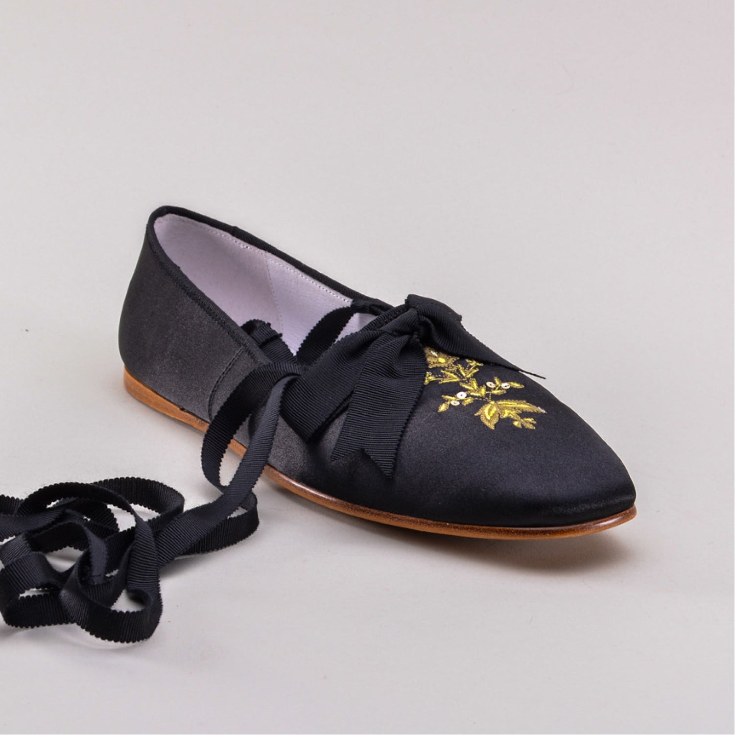 These slip-on shoes are accurate for c. 1800 - 1830. They feature a beautiful satin upper embroidered with a historical design on the vamp, complete with spangles. The edges are bound in petersham, with matching optional ankle ribbons and vamp bow which is easily removed. Period-correct turnshoe construction, soft square toe, and real leather soles make the Penelopes unmatched for evening and formal events where the prettiest of shoes are required. Wear them for Jane Austen, Napoleonic, War of 1812, and all Regency events.