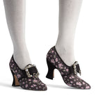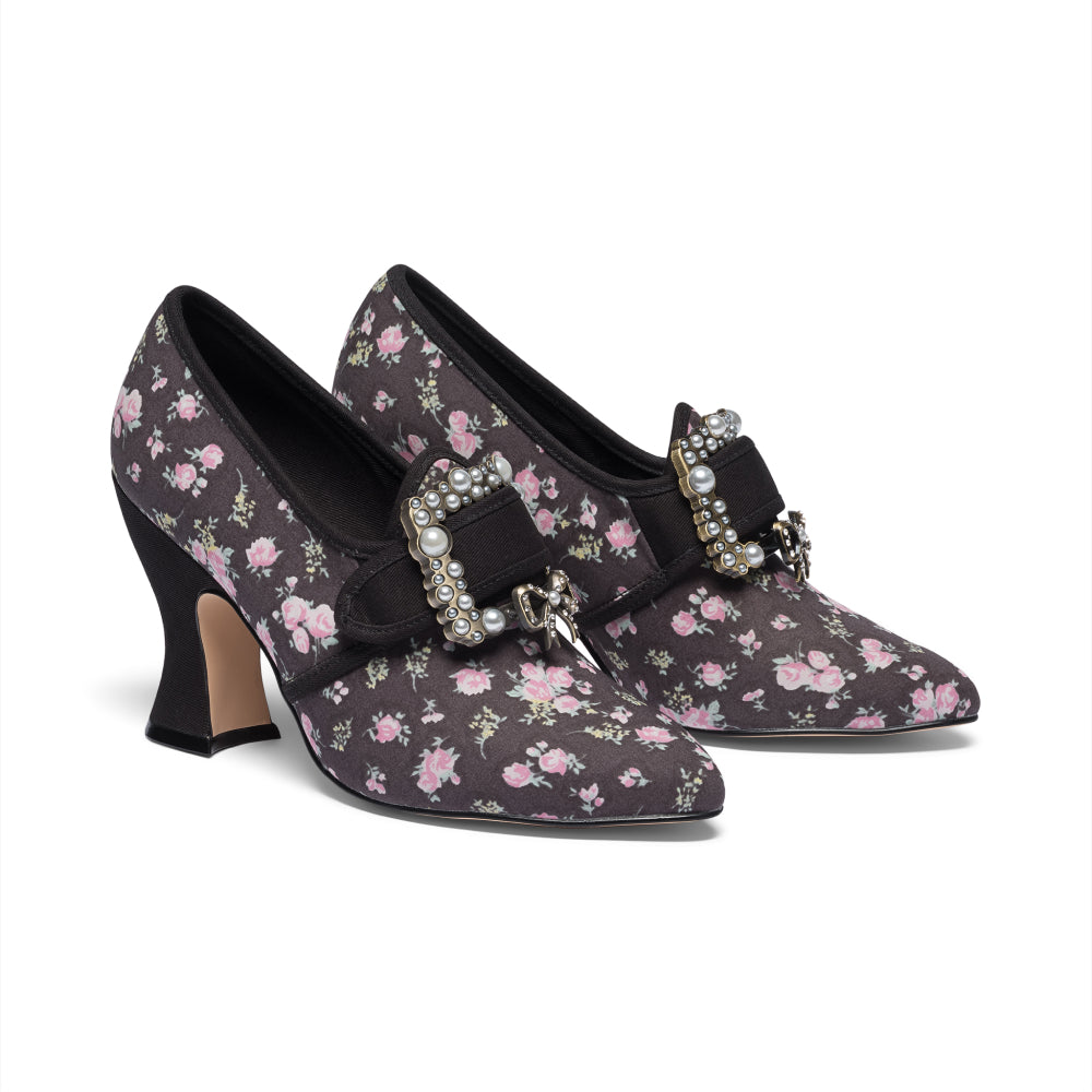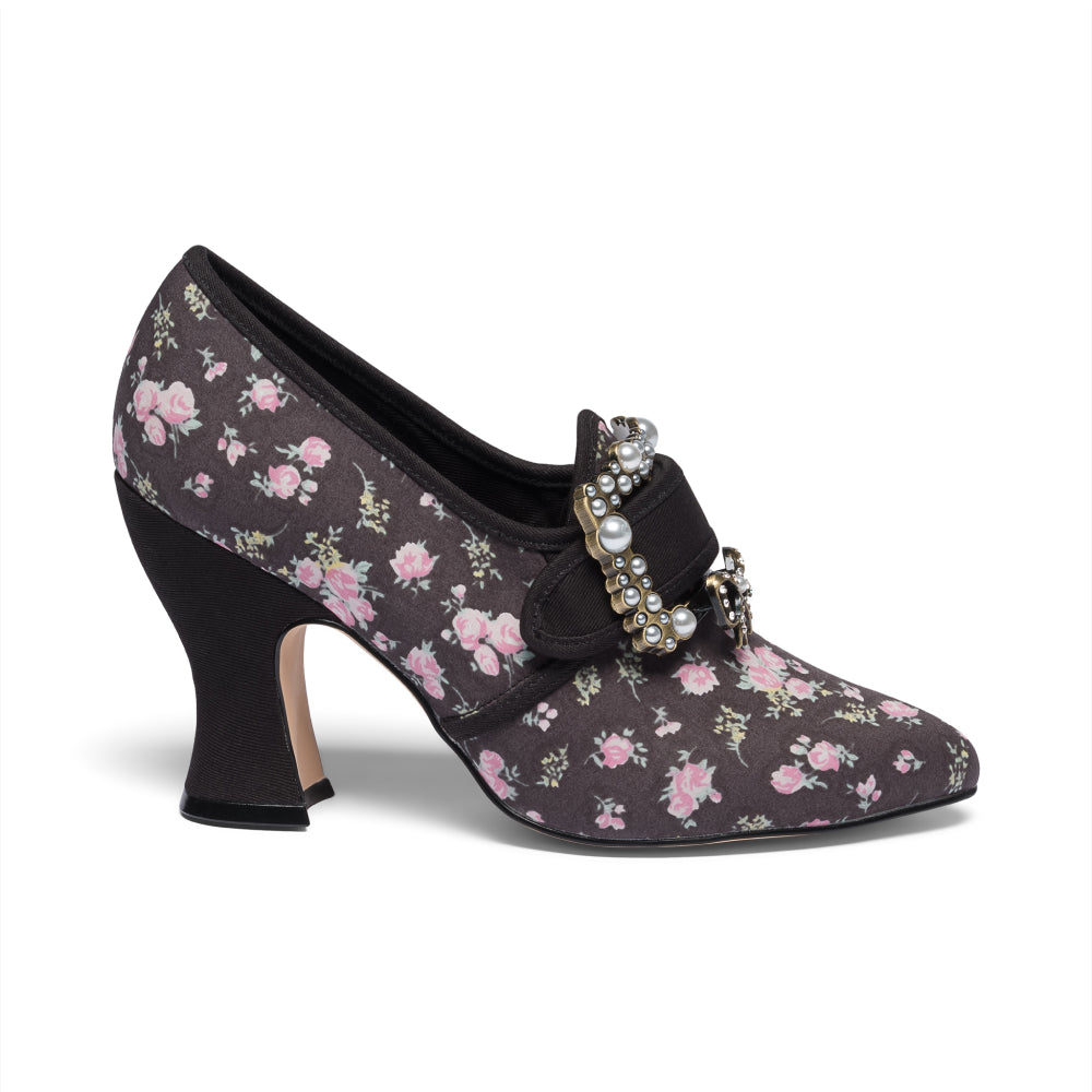 18th-century floral fantasies come to life with the gorgeous Adelaide Latchet Shoes, designed in collaboration with Elena Kanagy-Loux! Named for the 18th-century trailblazing artist Adélaïde Labille-Guiard, these shoes are dramatic, luxurious, and sure to make a statement. This curvaceous confection features 100% cotton uppers in a charming floral print set of by coordinating cotton canvas-covered heels and twill tape binding. Our custom 3.5"/ 7.62 cm French heels are perfectly balanced for comfort. Lined with cotton canvas and finished with a quality rubber sole, Adelaide is entirely leather-free. Adelaide’s 1.10"/28 mm, fully functional floral latchets look especially darling when fastened with matching Pearl Buckles.