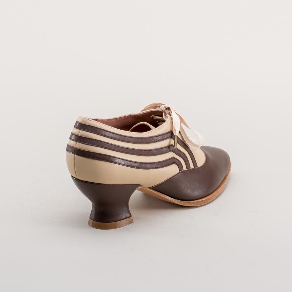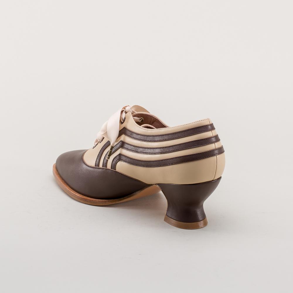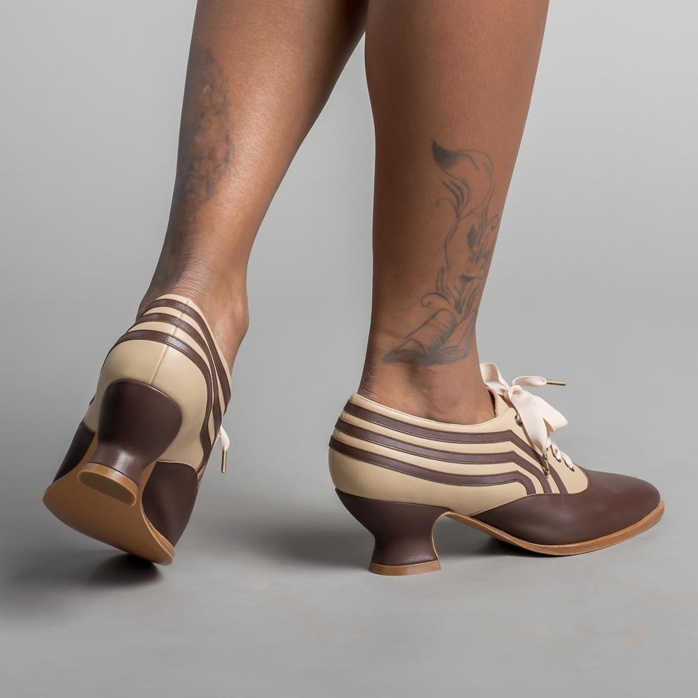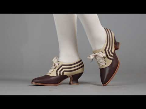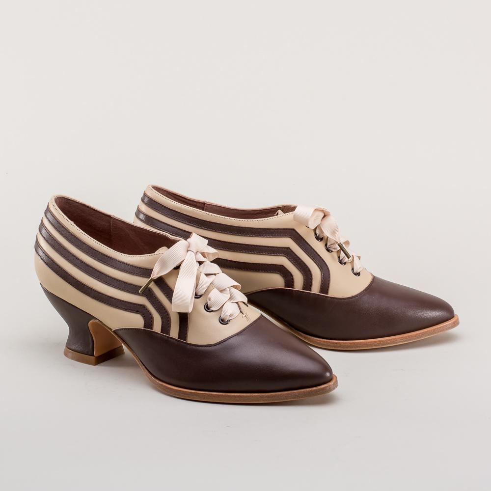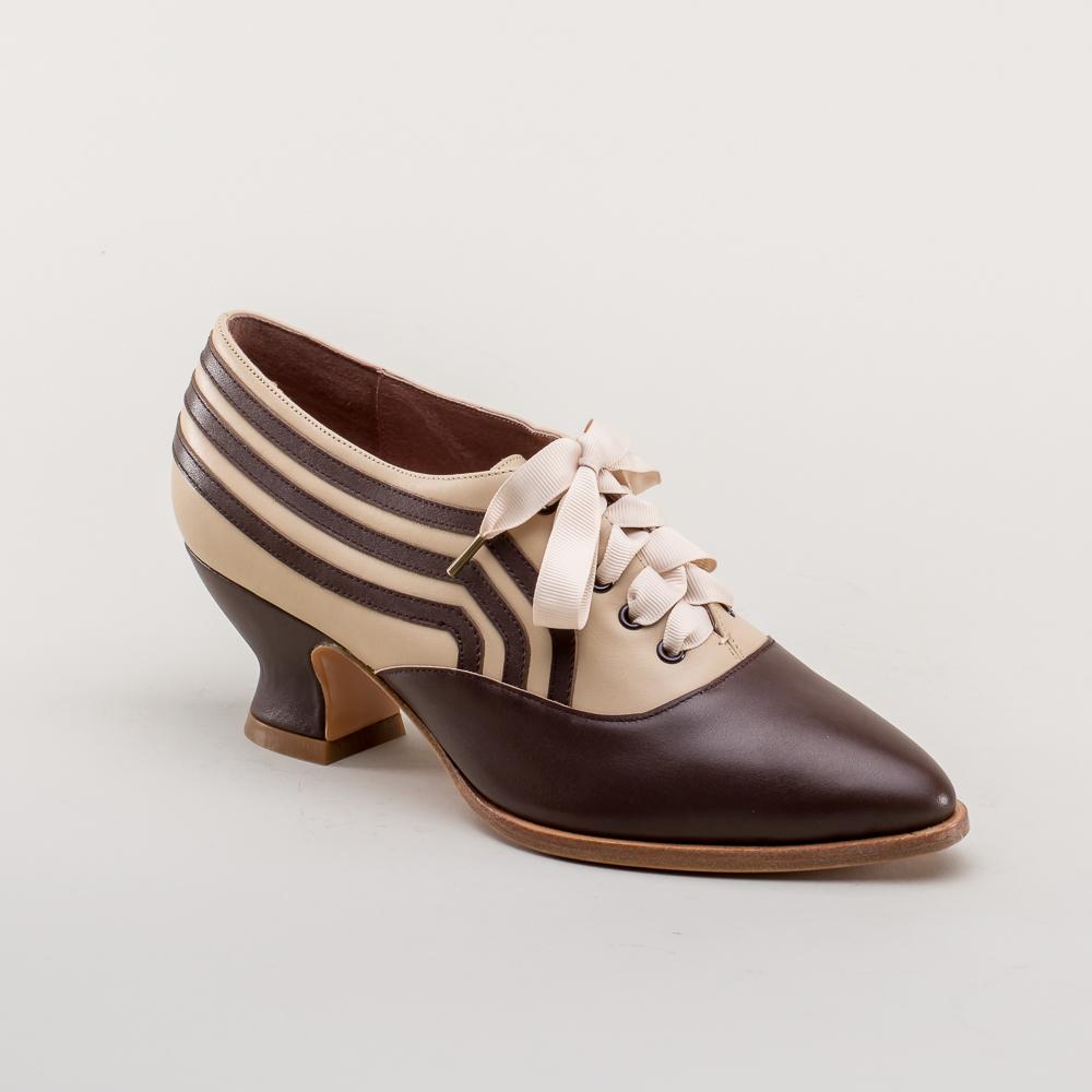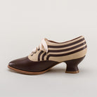 These attractive lace-up shoes have all the style and sass of footwear from c. 1900 through the 1920s and will keep you on your feet and comfortable all day, whether you're attending historical costuming events or walking the streets of New York City. Bernadettes feature our sturdy 2 inch / 5 cm French heel, welted hard-wearing leather soles, pointed toes, and an adjustable lace-up closure, plus all that style with eye-catching contrast stripes on all-leather uppers. Delicious!