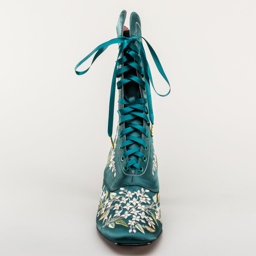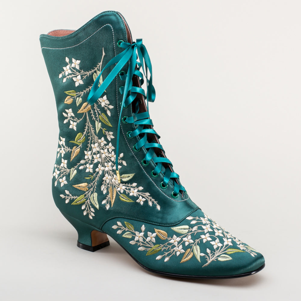 Indulge in a piece of history with Flora Embroidered Boots, an exclusive reproduction of the intricate opera and evening boots popular in the late Victorian period. Expertly crafted with intricate botanical detailing, these stunning satin boots will take you back to an era of sophistication and finesse. Wear them with bustle and Belle Epoque attire from the 1870s to c. 1900, or with modern dress as a statement piece.