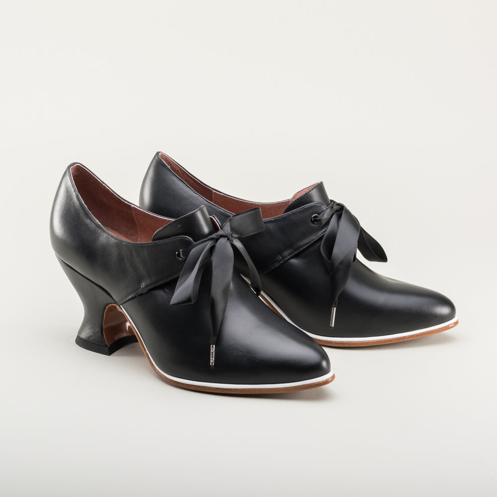 Named for the famous Madame de Pompadour, these heels are closely based on extant early 18th century shoes found in museums, and feature an easy tabbed closure that can be laced with your favorite colored ribbon, cockade, or pom-pom decoration.