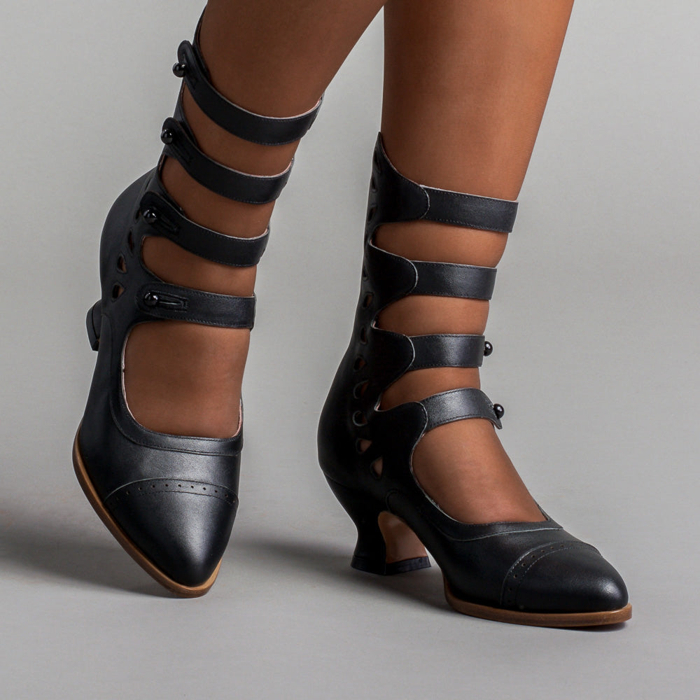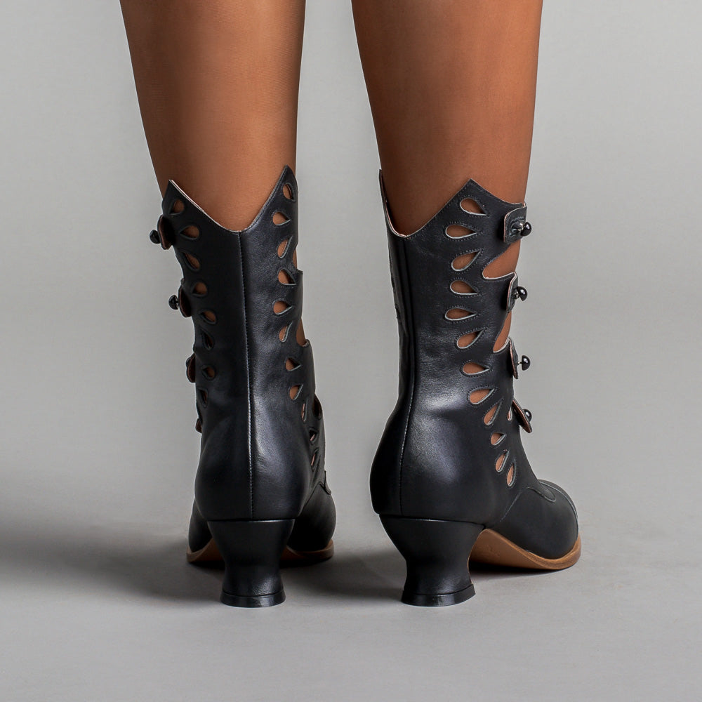 Colette Button Boots are incredible reproductions of true antique boots, featuring intricate cutout detailing and four straps closing with real buttons - no zippers here! To adjust each strap to fit you perfectly, simply move the buttons.