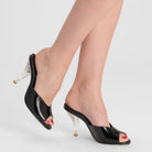 Put some spring in your step with Grace, a dazzling 1950s reproduction mule. These slip-on sensations are made with a period-accurate elasticated insole, which helps secure the shoe to the foot. Grace features our custom, one-of-a-kind, clear 1950s heel, bedecked with intricate etchings and a sparkling rhinestone. Choose from uppers in supple smooth leather, quintessential 1950s clear vinyl, or seductive hair-on cheetah print. Grace is fitted with a lightly treaded rubber sole, making her perfect for wearing poolside. Wherever you go, Grace is sure to turn heads!