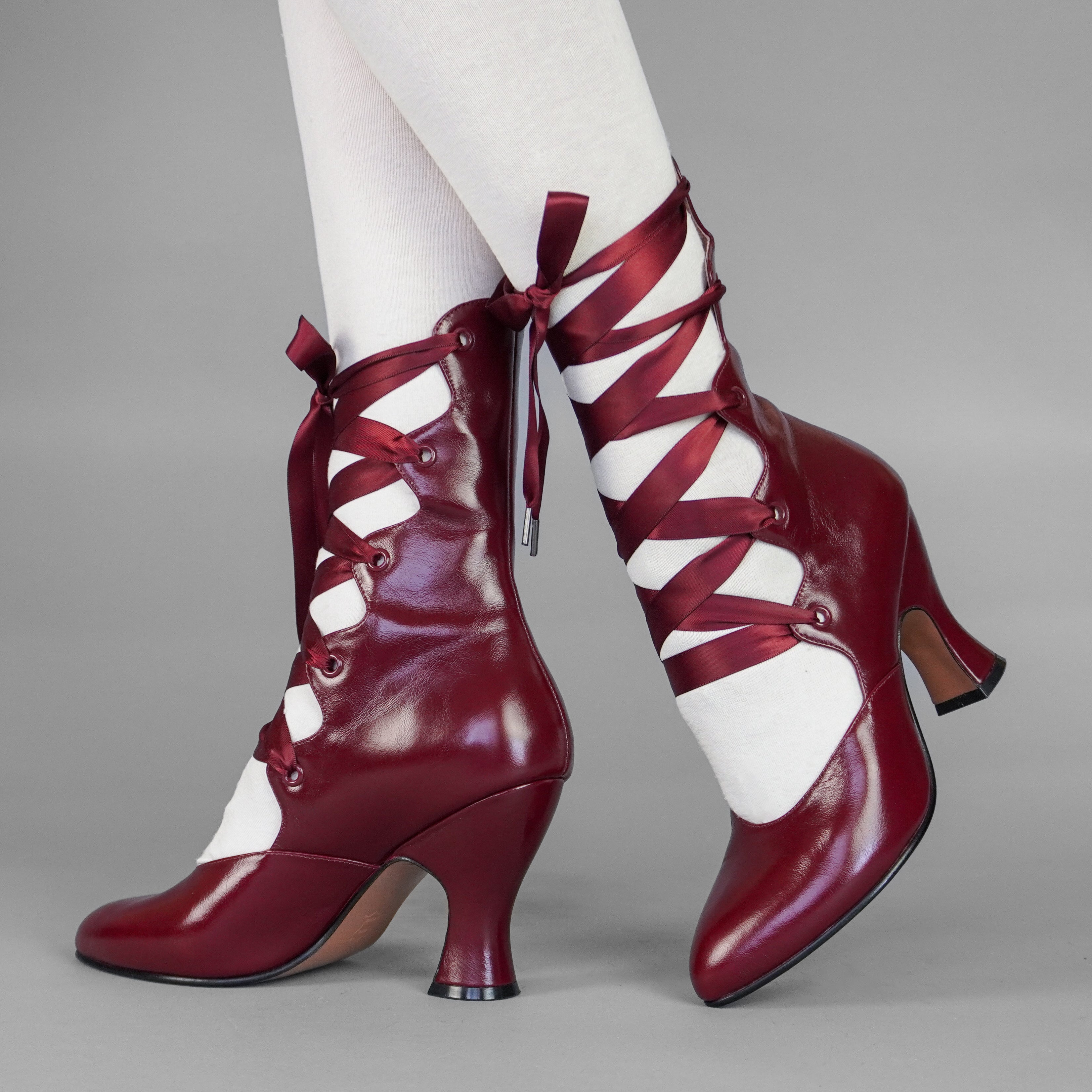 Tango Edwardian Boots are just as seductive as the Tango dance craze that swept the world in the 1910s. Designed to show off the legs, these gorgeous lace-up boots are based on several antique examples from 1900 through 1920. Tango features a deliciously curved shaft and scalloped tabs, which are laced with double-faced satin ribbon laces. Tango comes with two sets of ribbon laces, for adjustable sizing. Smooth leather uppers are stunning in a variety of beautiful colors. Tango sports a brand-new, custom 3.5 inch/ 8.9 cm French heel- our highest heel yet! Tango's heel is just as curvy and sumptuous as it is well-balanced, so you can dance the night away.