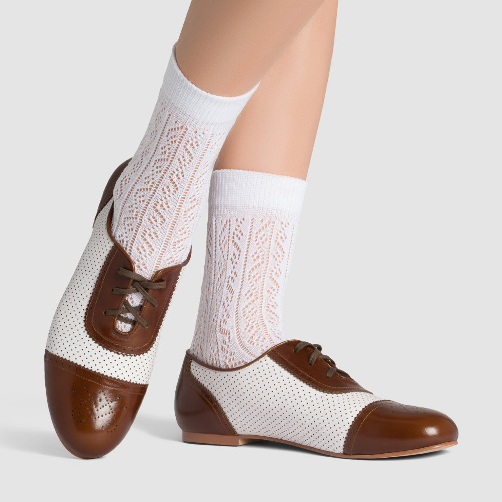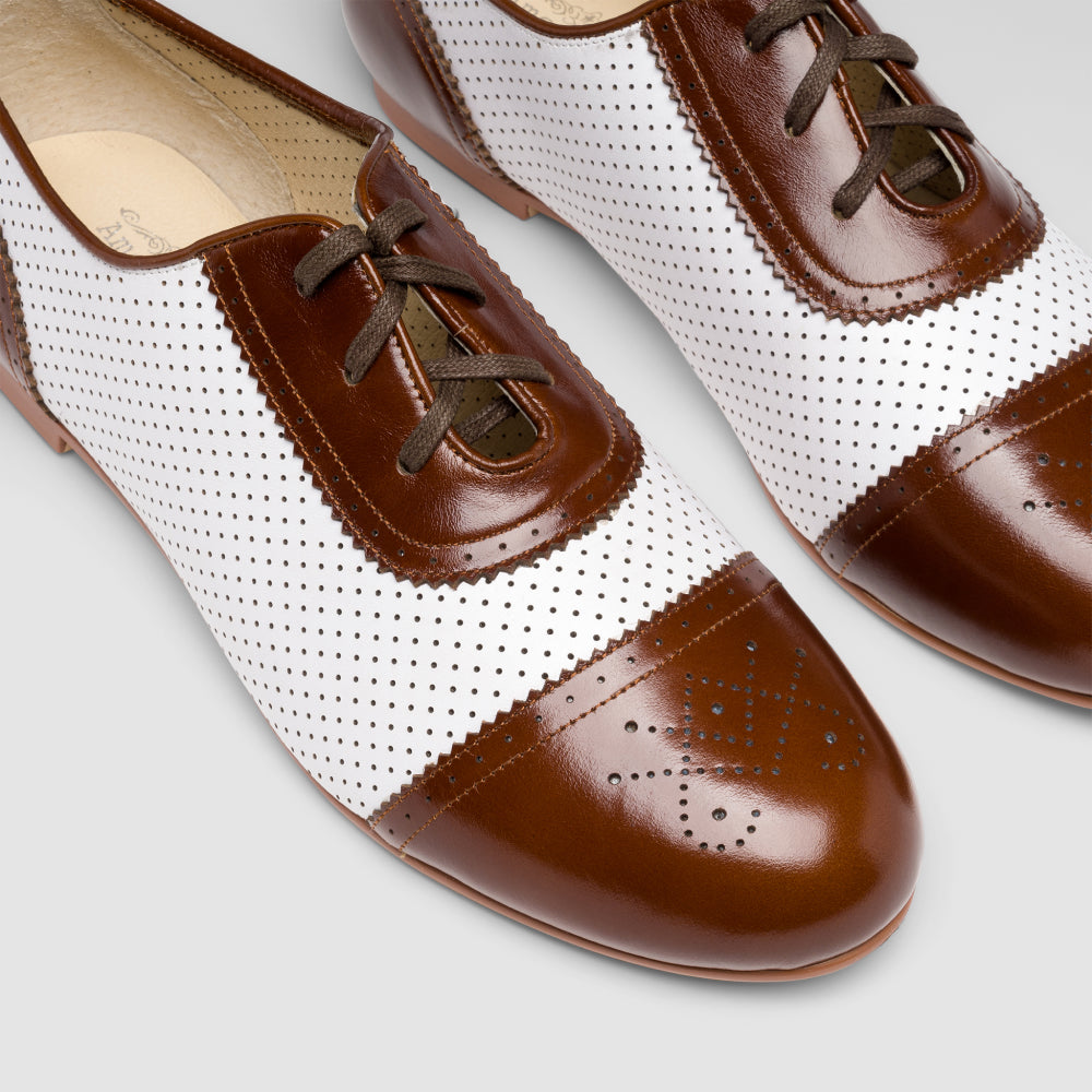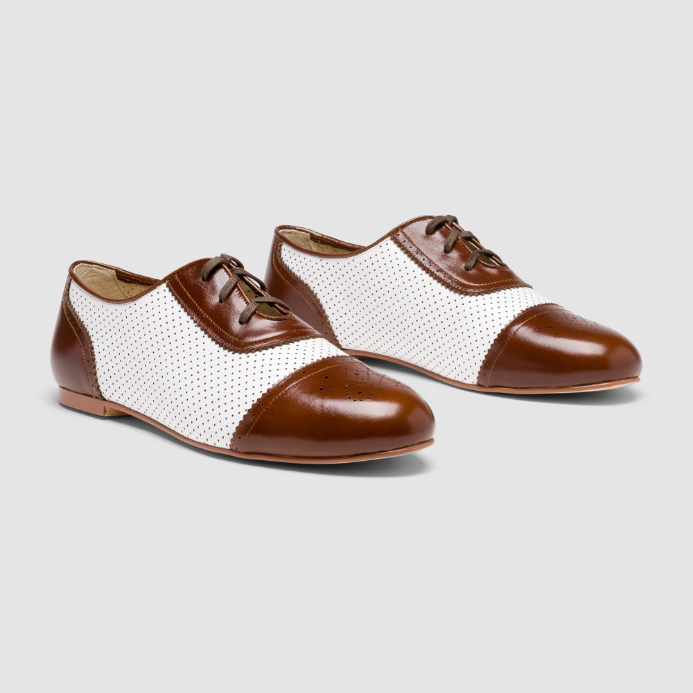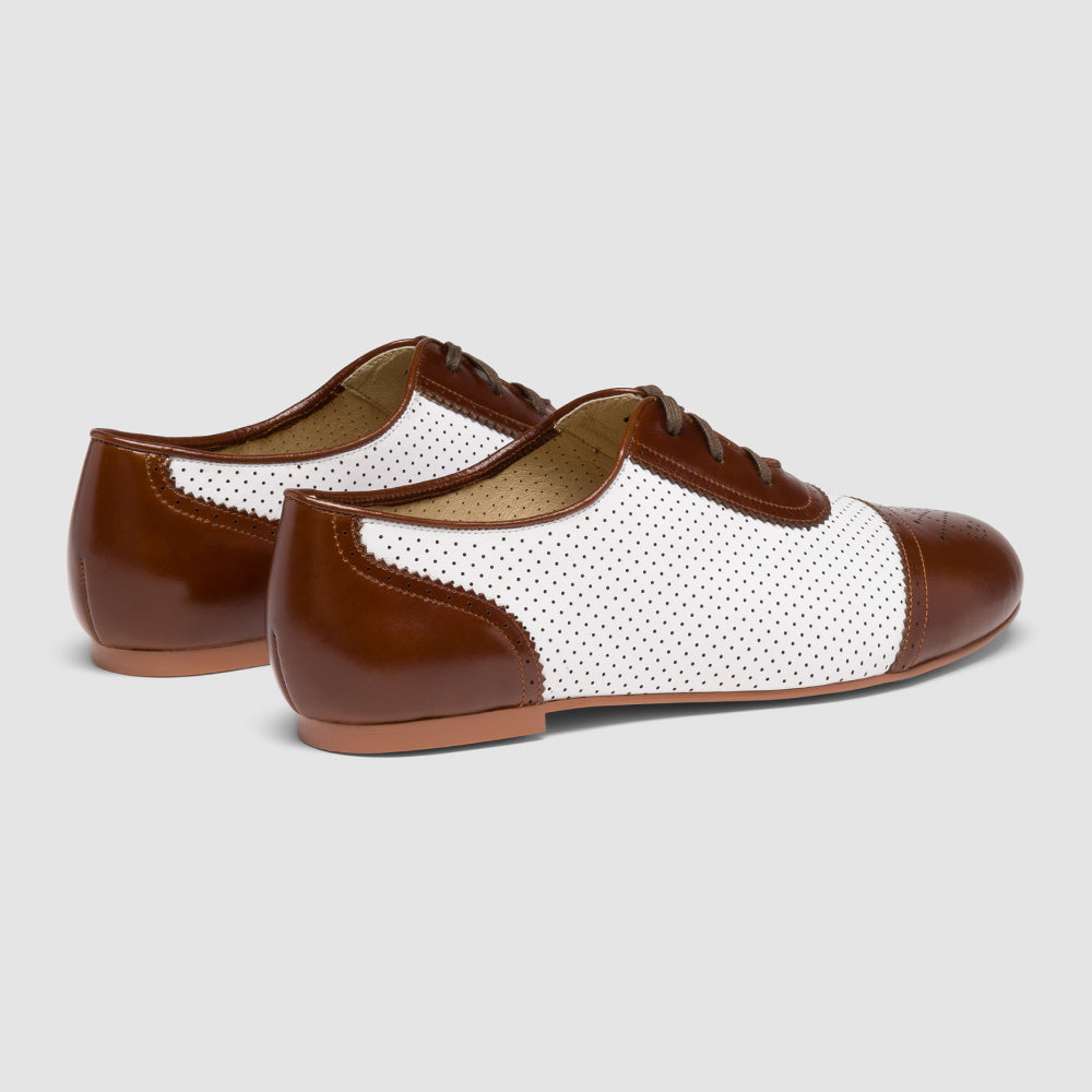 Fore! Look out for Beverly! These smart little flats are your go-to shoe for any activity. Based on vintage sporting shoes and flat-soled leisure footwear, Beverly has the vintage aesthetic you desire with all the comfort of contemporary footwear. Made from soft, flexible leather, Beverly molds beautifully to your foot. Beverly features perforated uppers with brogued heel counters and toe caps in fresh colors. Rubber soles and low rubber heels make Beverly durable and easy to walk in, whether you're trying your hand at pitch-and-putt or trekking across cobblestone streets on sightseeing expeditions.