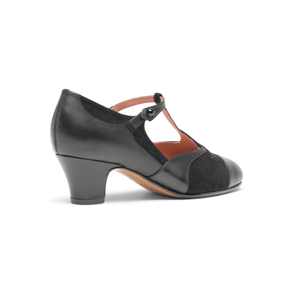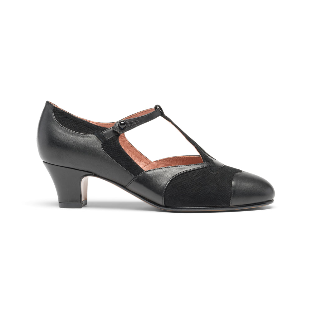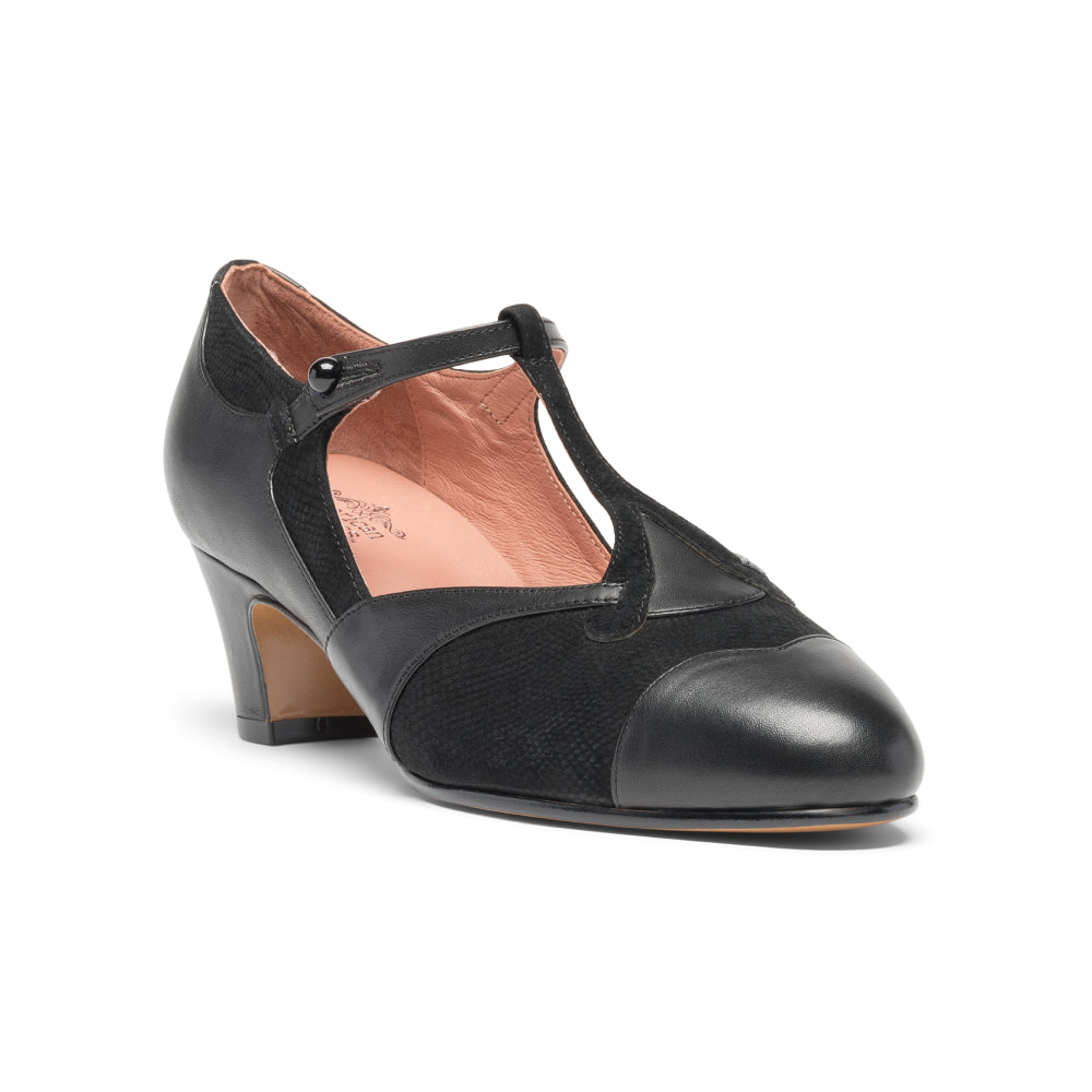 The hunt for a chic and unique 1920s daywear shoe is complete with Doris, a lovely serpentine and strappy pump. Beautifully cut smooth leather foxing intertwines with python-embossed leather or suede in rich color combinations, set off by a finely detailed strap with a functional button closure. Doris is built on a period-accurate and comfortable 1920s last, with a low, perfectly balanced 1.75"/4.45 cm Cuban heel. Doris is available in regular and wide width.
