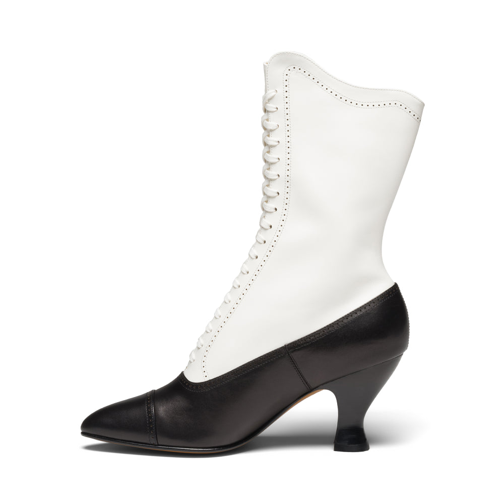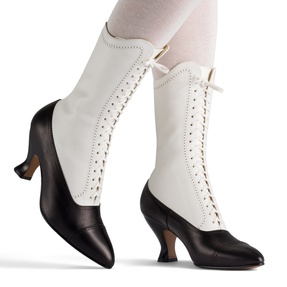 Introducing Edith, the spool-heeled Edwardian boot you have been dreaming of. Carefully designed and based on antique originals, Edith is accurate to 1890 through 1920. Edith features a custom, curvaceous, and perfectly-balanced 3”/ 7.6 cm French spool heel, which makes an ideal base for our custom last. Edith’s super-soft leather uppers are crowned with a splendidly shaped top, and set off by handsome broguing on the shaft and toecap. The period-accurate curve along the back of the boot gracefully hugs the calf, just like real Edwardian boots. Available in both standard and wide width, Edith fits a wide range of calf sizes. Each pair of Ediths comes with two sets of laces, for increased adjustability. The top of Edith Boots do not extend to the widest part of the calf muscle. Measurements scale slightly based on size.