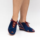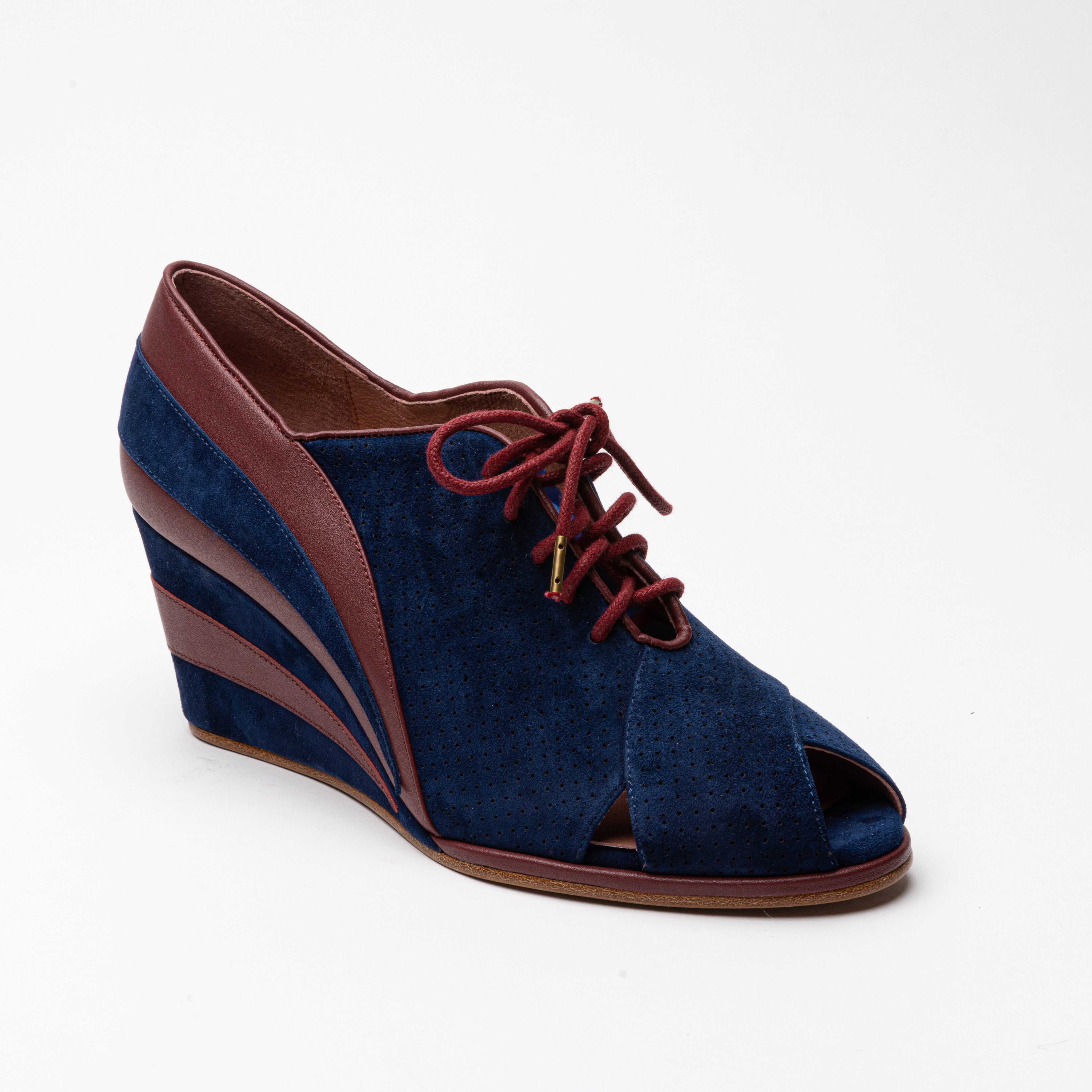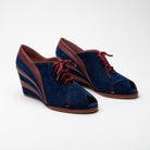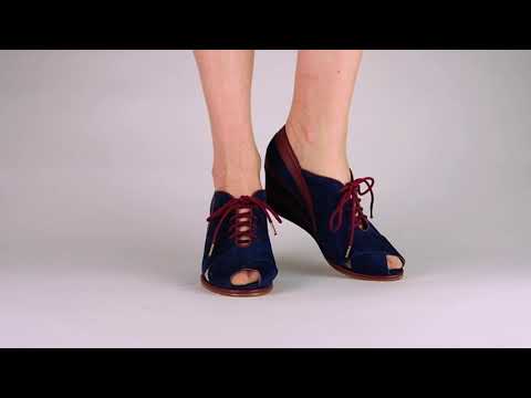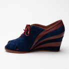 The artistic inspirations of the 1930s come to life with the Esme 1930s Wedge! Stunning striations in smooth leather and suede seamlessly blend together Esme's heel and upper for an especially graceful look. Our custom 2.75"/ 6.9 cm wedge heel is perfectly sculpted and balanced for all-day comfort. Esme's perforated suede vamp and charming peep-toe complete this irresistibly unique shoe. Accurate to the 1930s through 1940s, Esme is ideal for your favorite vintage and contemporary ensembles.
