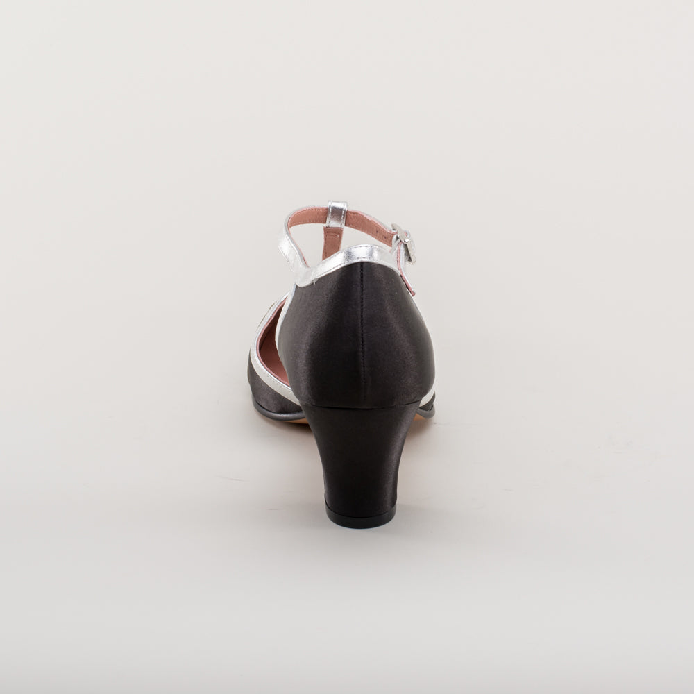 The flappers knew how to have fun with footwear, and the Lilith vintage flapper t-strap sandals pay homage to that spirit. Made in luminous satin paired with metallic leather and rhinestones, the Lilith flapper shoes are closely based on an original celadon green and silver pair in the Shoe Icons museum. These gorgeous shoes are accurate for the 1920s, 1930s, and 1940s, and offer our refined and stable 2.5 in / 6.3 cm Spanish heel paired with open d'orsay sides and an almond toe with cutouts on the vamp.