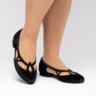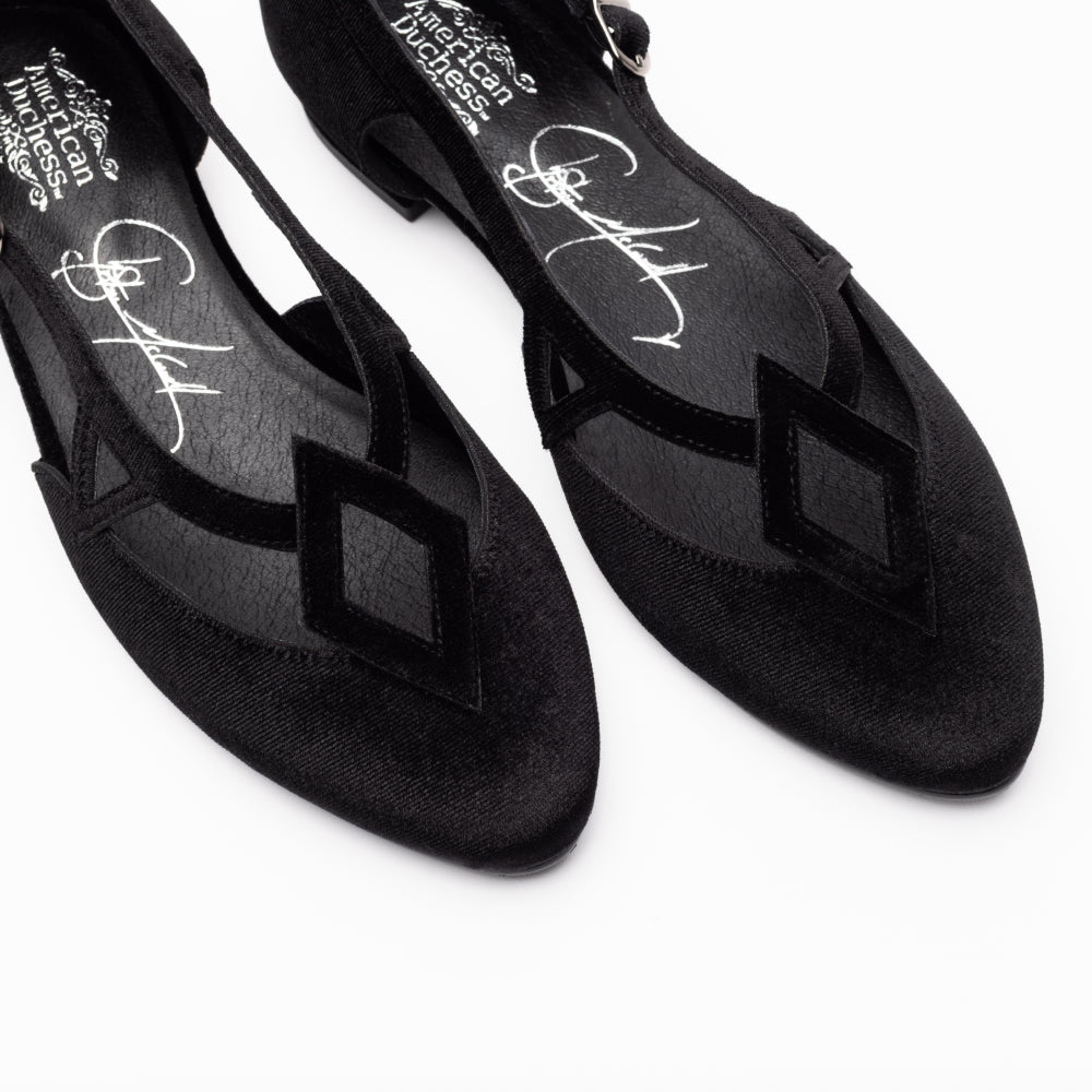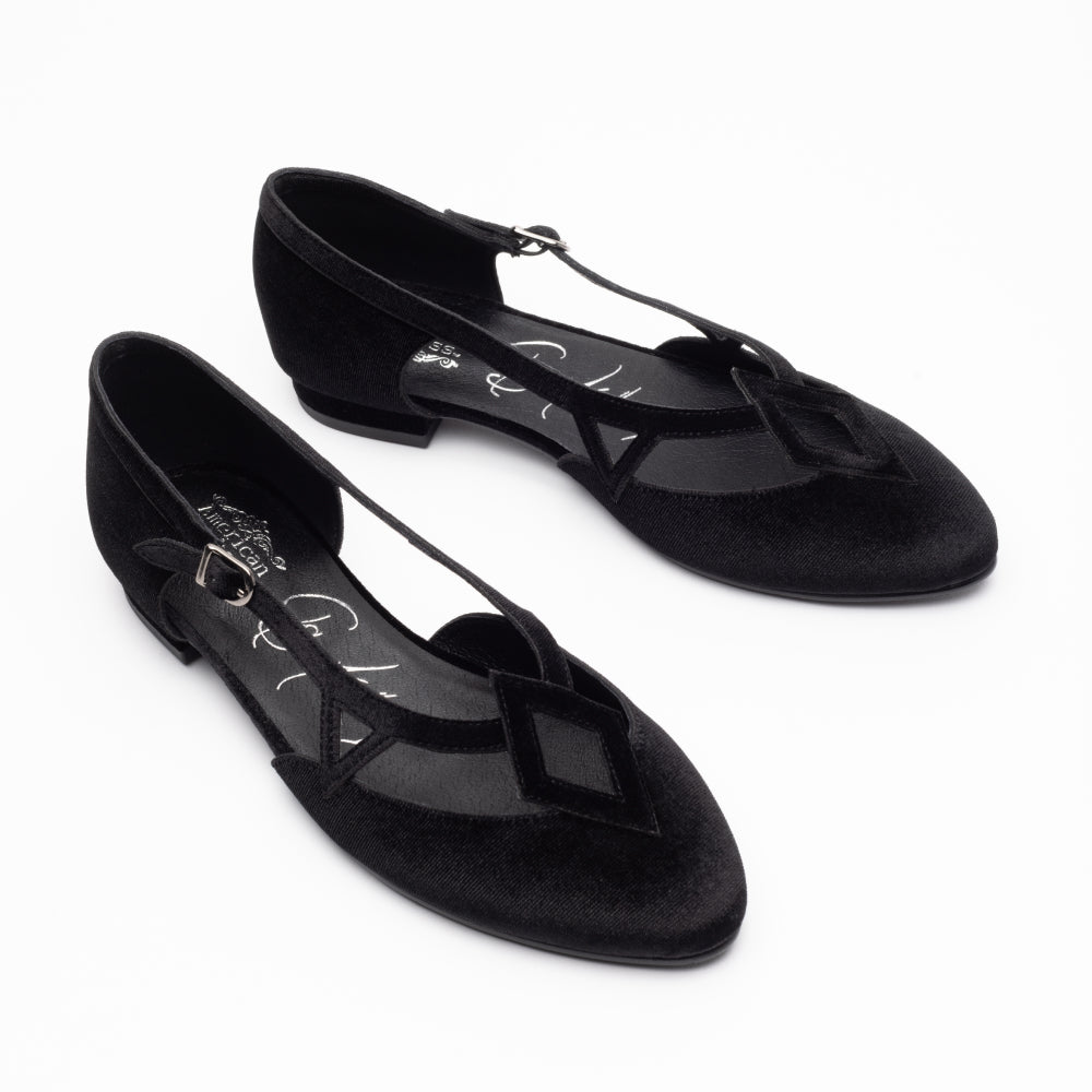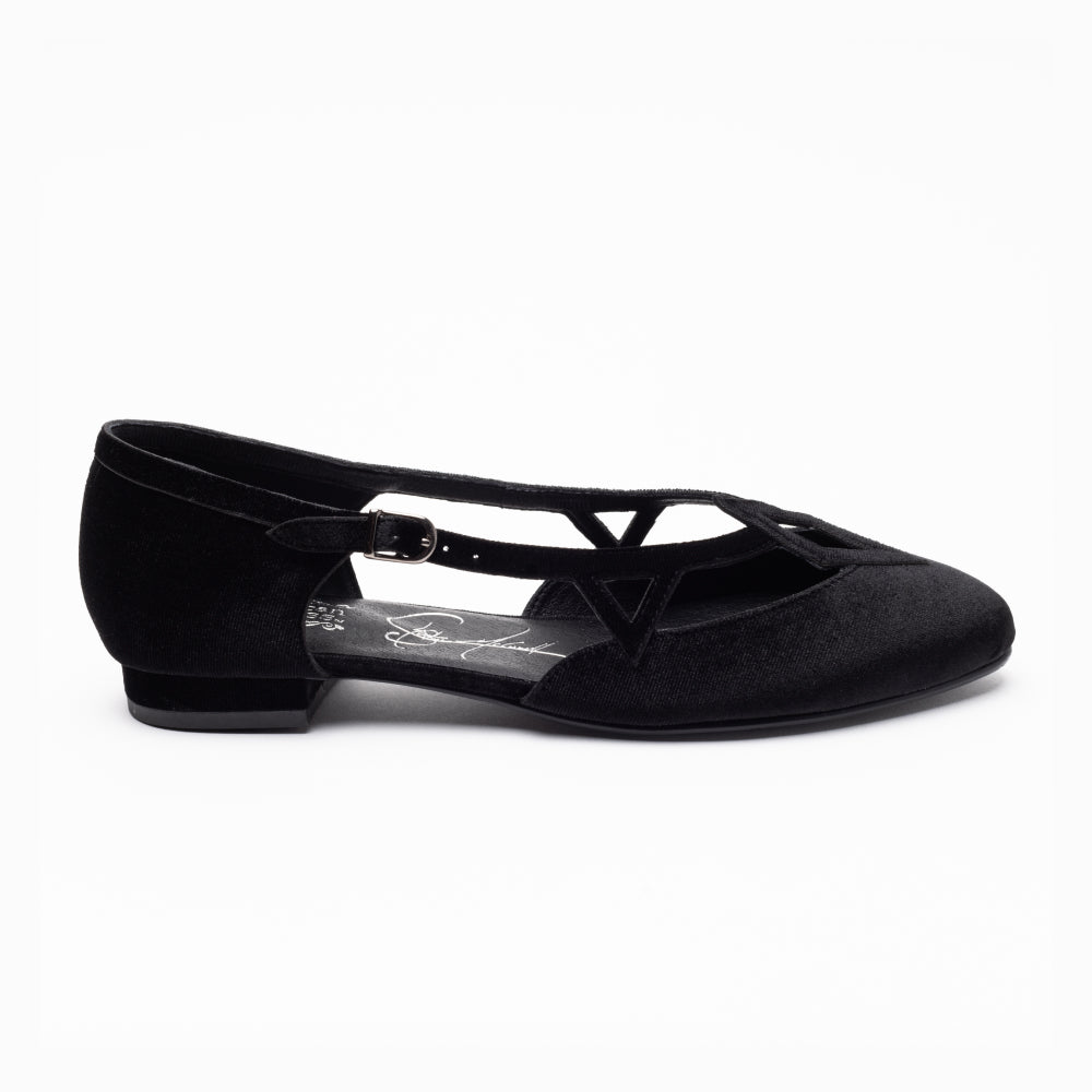 Step into a vintage-inspired fantasy with the Mildred Flats, from our collaboration collection with artist Christine McConnell! Inspired by 1950s 'flatties', these flats are unlike any you've seen before. Uppers in rich, luxe velvet, open sides, and strappy details festooned with geometric motifs make Mildred unique. Mildred features our dependable 0.5"/ 1.27 cm common sense heel, which is low and sturdy for all-day comfort. These shoes are festive, leather-free, and come in five gorgeous colorways.